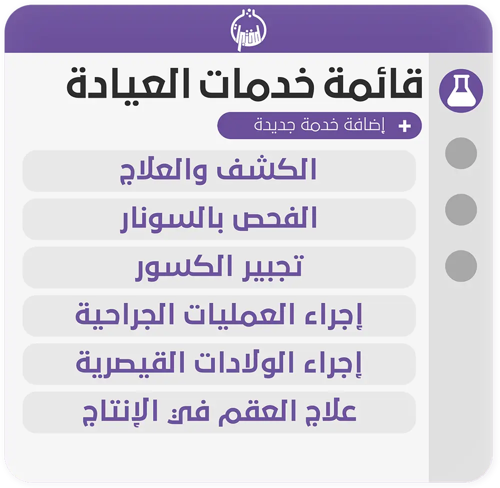 يساعد النظام العيادة البيطرية على توفير العديد من الخدمات لعملائها والتي تشمل الكشف والعلاج، والفحص بالسونار، وتجبير الكسور، وإجراء العمليات الجراحية وإجراء الولادات المتعسرة والقيصرية، وعلاج العقم في الإنتاج، الزيارات الحقلية، برنامج تجهيز العشائر، إجراء التطعيمات الموسمية. مما يوفر سجل منظم ووافي لإدارة المختبر لمتابعة جميع خدمات العملاء من النواحي التنظيمية والمالية.