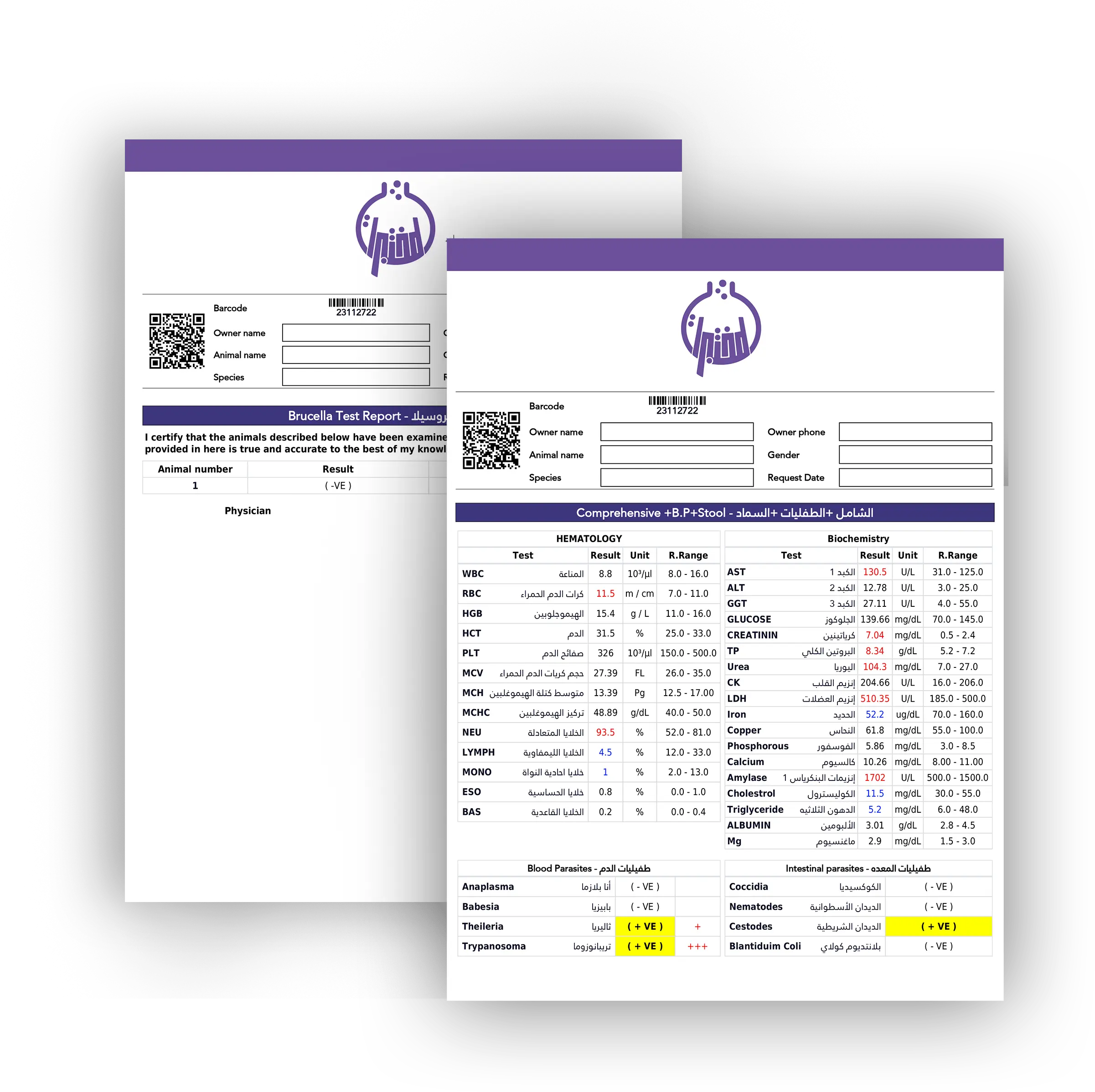 يحتوي النظام على العديد من الفحوصات البيطرية مثل: فحص الدم، وفحص الكيمياء، وفحص الطفيليات الدموية والمعوية، وفحص المالطية، وفحص المالطية الإليزا، وفحص البول. كما يوفر النظام إمكانية تعديل الوحدات الطبية والقيم المرجعية لكل حيوان وأسماء الفحوصات باللغة العربية وإضافة فحوصات اخري.
